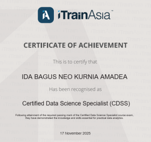 Sertifikasi CDSS yang diterbitkan oleh iTrainAsia bekerja sama dengan MarkPlus Institute ini merupakan program komprehensif yang berfokus pada pengembangan keahlian di bidang analisis data, machine learning, dan pengambilan keputusan berbasis data (data-driven decision-making). Sertifikasi ini diterbitkan secara resmi oleh iTrainAsia pada tanggal 17 November 2025. Pencapaian ini diraih setelah melalui serangkaian ujian kompetensi yang ketat untuk memvalidasi keahlian dalam mengelola, menganalisis, dan menginterpretasikan data kompleks menjadi wawasan strategis.